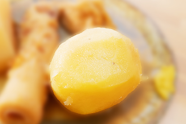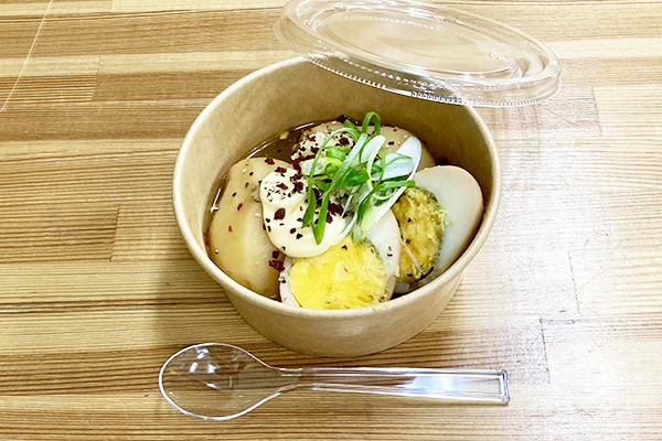 おでんのじゃがいもとたまごとお出汁 白髪ねぎや胡椒とともに、大人の味わい (画像はテイクアウト容器)