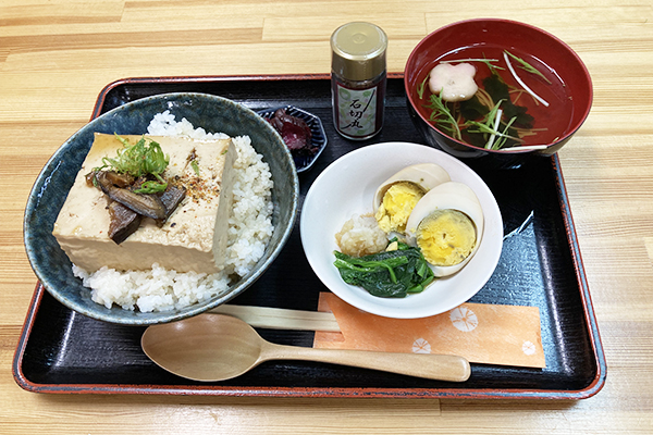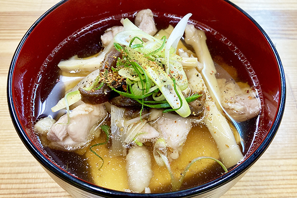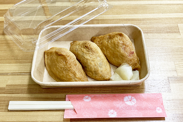 とり肉・椎茸佃煮・たけのこ、 大きめ豆腐の入った食べる汁物 セットは、縁起のおでん3種、いなりめし3種が選べます